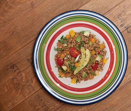 Meanwhile, in medium bowl toss tomatoes, avocado, peppers, onions and parsley. Drizzle with oil and lemon juice; sprinkle with steak spice; toss well. Add cooled Cavena Nuda, toss again and serve.