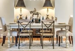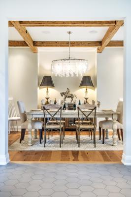 In the regal dining room, two refurbished black-fabric lamps flank an antique bronze sculpture of horse and rider that once belonged to Tara’s grandmother. A dramatic oval chandelier festooned with translucent capiz shells adds whimsy to a ceiling framed in barn wood beams.