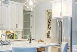 Seeking to achieve a balance between modern and traditional styles, they introduced elements such as an artful chrome faucet and clover-shaped pendant lamps, in and above the kitchen island, to prevent a prized modern fixture from stealing the show. New quartz countertops and a marble backsplash of oversized subway tile add sparkle next to high-back stools in cozy, quilted grey jersey.