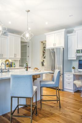 Décor for the newly-renovated areas was predominantly inspired by treasured pieces of inherited art and equestrian interests. Blues and taupe shades appearing in fabric and accessories throughout the open-concept kitchen and family room are pulled from horse paintings by Mark’s 95-year-old grandfather that face a pair of bucket chairs covered in distressed saddle leather.