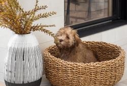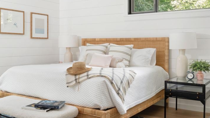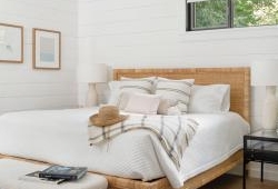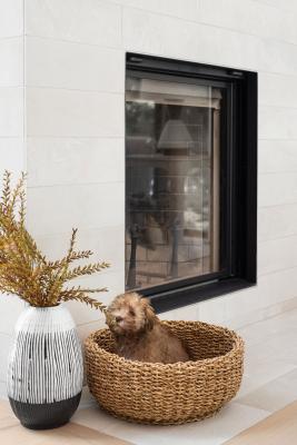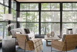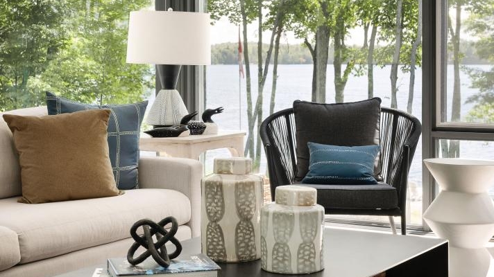 While the interior details are outstanding, they don’t distract from the obvious focal point — the lake. A neutral palette allows for textural elements like wood and woven materials to inject intrigue into the décor, which Leclair Décor has tastefully implemented. “With the exception of some deep blue and soft green accents (a direct nod to the surrounding landscape), we kept the colour scheme fairly neutral. We warmed up the all-white space with rustic wood finishes throughout with lots of woven texture, and plenty of cozy throws and pillows,” offers Melissa Leclair.