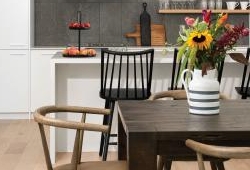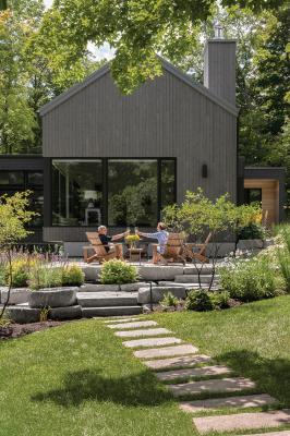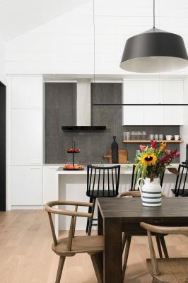 The dwelling sits within a treed area of the property, and although it has modern elements, there is a depth of character to the structure. “This project is a blending of familiar traditional domestic forms with modernism. We tried to create a warm and inviting cottage while being distinctly contemporary,” Chris Simmonds explains. The feeling is carried through to the indoor space, where the attention to detail is noteworthy, for which Chris credits the project architect. “Gabe Prost paid particular attention to some of the special details used on the stairs, the kitchen, and the fireplace to create a unique character,” Chris explains.