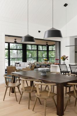 The fireplace, which often finds itself on a dominant wall, takes a backseat here to the expansive windows that drink in nature’s beauty, showcasing the lake through the trees. However, a wall of cream tile is a dramatic statement for the contemporary fireplace the family gathers around during the cooler months. When the weather is warm, the grand screened porch, with comfy seating and a large dining table from RH, offers the ideal gathering spot.